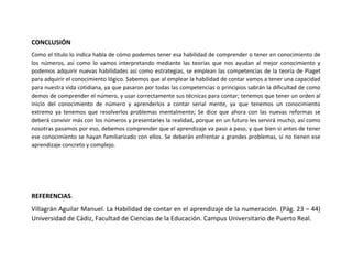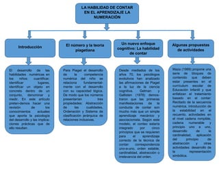 El documento discute el desarrollo de las habilidades numéricas en los niños según las teorías de Piaget y los estudios cognitivos más recientes. Explica que para Piaget, el desarrollo de las competencias numéricas está relacionado con el desarrollo de la lógica. Los estudios cognitivos desde los años 70 han analizado esta visión y demostrado que contar involucra principios como correspondencia uno-a-uno y cardinalidad. Finalmente, el documento propone actividades para el currículo escolar que enfatizan el