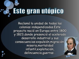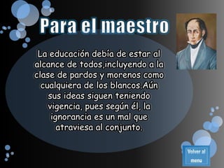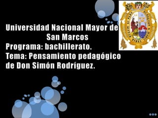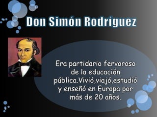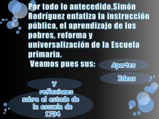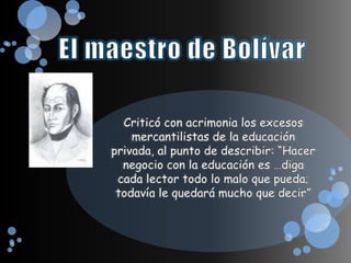 Este documento resume las ideas pedagógicas de Andrés Bello sobre la educación. Bello abogaba por una educación formal y sistemática para todos, no solo para la clase privilegiada. Proponía distribuir la enseñanza en varias partes y entre varios maestros calificados para que sea accesible a todos y se acomode a las necesidades de los estudiantes. También enfatizaba la importancia de que exista un director que supervise a los maestros y la administración de la escuela.