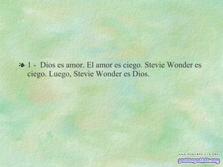 El documento presenta una serie de razonamientos ilógicos y absurdos utilizando premisas sin fundamento. Se afirma de forma ilógica que Stevie Wonder es Dios, que un tomate es mejor que la felicidad eterna, y que cuanto más queso hay menos queso realmente existe. También se concluye de forma absurda que el autor es a la vez Dios, Stevie Wonder y ciego.