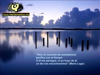El documento presenta una serie de citas y pensamientos sobre diferentes temas como el tiempo, el amor, la vida y el aprendizaje. Algunas de las ideas principales son: 1) El tiempo es subjetivo y depende de la perspectiva y emociones de cada persona; 2) El amor tiene componentes de locura pero también de razón; 3) Para vivir plenamente la vida hay que mirar hacia adelante a pesar de que sólo se pueda comprender mirando hacia atrás.
