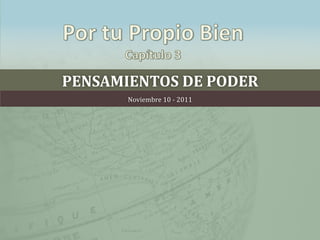 Este documento habla sobre la importancia de controlar los pensamientos y creencias. Explica que la batalla se libra en la mente y que el enemigo trata de plantar pensamientos tóxicos para formar "fortalezas" basadas en mentiras. Recomienda identificar los pensamientos tóxicos predominantes y derribar las fortalezas renovando la mente con lo que se ingresa, ve, escucha y lee. También enfatiza que la renovación es un proceso continuo y que hay que mantenerse libre ocupando la mente con cosas posit