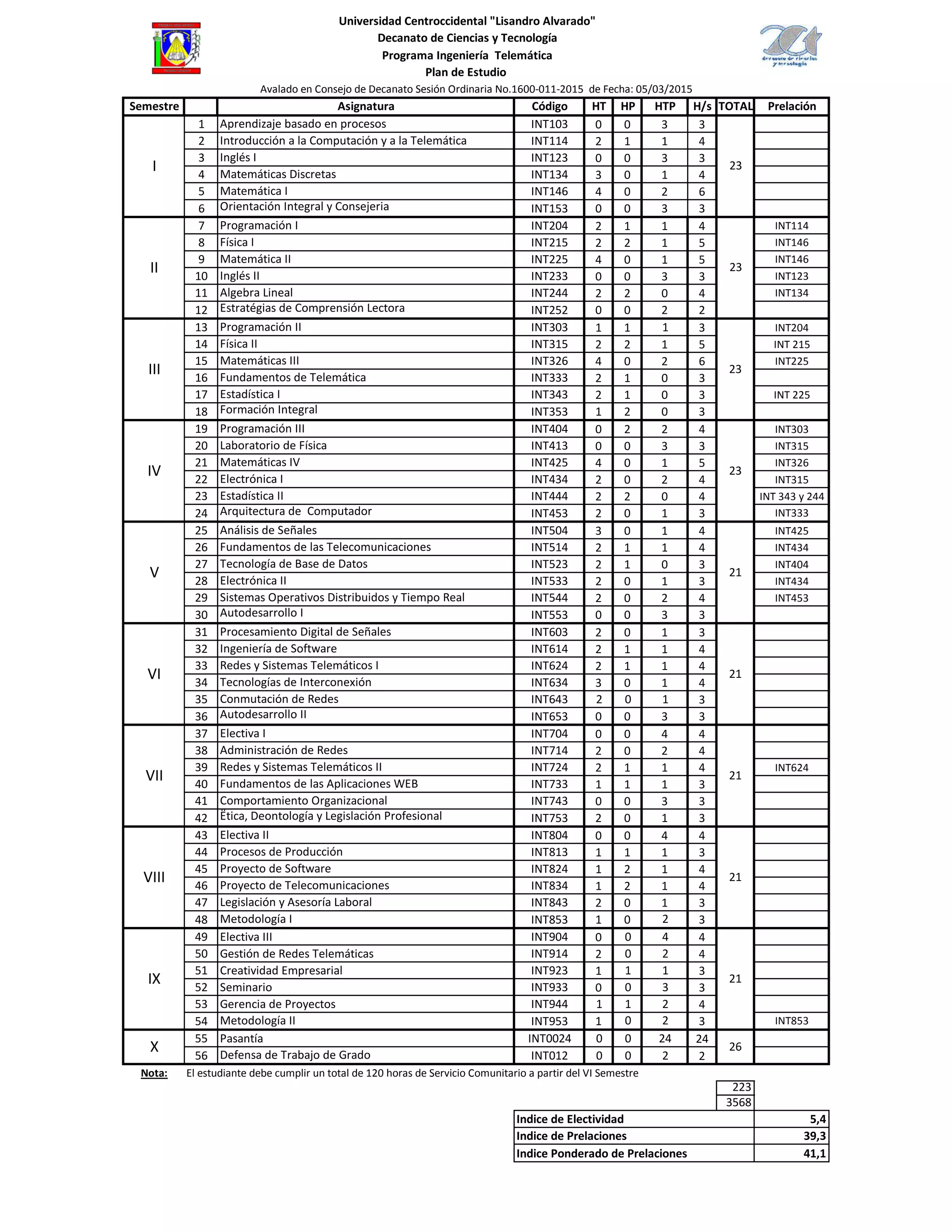 El documento presenta el plan de estudio de Ingeniería Telemática de la Universidad Centroccidental "Lisandro Alvarado". El plan consta de 10 semestres con asignaturas en diferentes áreas como matemáticas, física, programación, electrónica, redes y sistemas telemáticos. Cada asignatura tiene un código, número de horas teóricas, prácticas y totales, y puede tener asignaturas prerequisito.