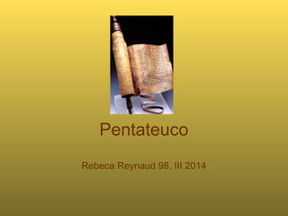 El documento resume las principales secciones del Pentateuco: Génesis habla de la creación y los primeros patriarcas, Éxodo trata de la esclavitud en Egipto y la liberación, Levítico presenta las leyes sobre santidad y culto, Números incluye censos y listas de personas, y Deuteronomio es el testamento espiritual de Moisés antes de entrar a la tierra prometida. Además, explica que el Pentateuco recibió su forma actual después del destierro de Babilonia y enseña que