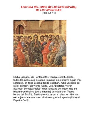 El documento describe los eventos del día de Pentecostés según el libro de los Hechos de los Apóstoles. Los apóstoles recibieron el Espíritu Santo, el cual les permitió hablar diferentes idiomas para comunicarse con personas de diversas naciones. Estas personas se sorprendieron al escuchar a los apóstoles hablar en sus propios idiomas. El salmo responsorial pide a Dios que envíe su Espíritu Santo para renovar el mundo.