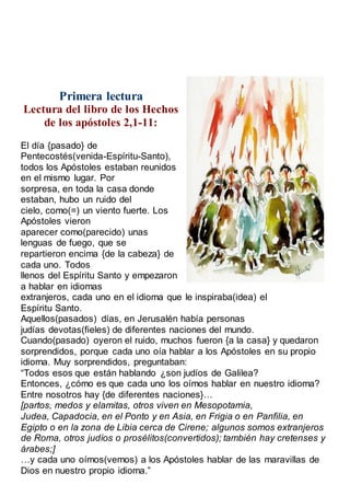 El documento resume la lectura del día de Pentecostés en la que los apóstoles recibieron el Espíritu Santo y comenzaron a hablar en diferentes idiomas. También incluye las lecturas de la primera carta de san Pablo a los Corintios sobre los dones del Espíritu Santo y el Evangelio de san Juan en el que Jesús envía a los apóstoles y les da el poder de perdonar pecados tras resucitar.