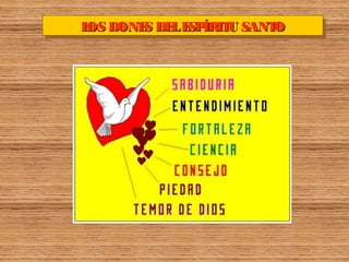El documento habla sobre los dones del Espíritu Santo. Menciona que los dones permiten ver el mundo desde la perspectiva de Dios y comprender los misterios de la Trinidad, la cruz y el reino de Dios. También permiten testificar la fe con valentía y vivir la naturaleza como un regalo de Dios con alegría y esperanza.