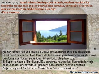 El documento describe la aparición de Jesús resucitado ante sus discípulos reunidos en una casa con las puertas cerradas por miedo. Jesús les dice "Paz a vosotros" y les muestra sus heridas. Les da el Espíritu Santo y los envía a continuar su misión de llevar el perdón y la reconciliación. El Espíritu nos capacita para construir el Reino de Dios y responder al amor de nuestro Padre Dios.