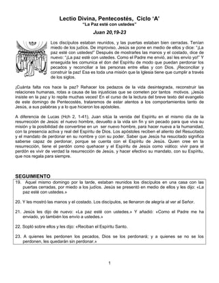 1) El documento resume el pasaje bíblico del Evangelio de Juan sobre la aparición de Jesús resucitado a sus discípulos y el don del Espíritu Santo. 2) Jesús les da la paz y los envía a predicar el evangelio y perdonar los pecados con el poder del Espíritu. 3) El resumen reflexiona sobre la misión de la Iglesia de construir la paz y el perdón a través del poder del Espíritu Santo.
