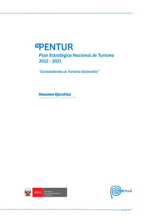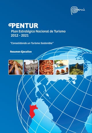 Este documento presenta el Plan Estratégico Nacional de Turismo del Perú (PENTUR) para el período 2012-2021. El PENTUR tiene como objetivo posicionar al Perú como un destino turístico competitivo y sostenible a través de 9 objetivos estratégicos que buscan incrementar las divisas, los turistas nacionales e internacionales, diversificar la oferta turística y fortalecer el recurso humano en el sector turismo. El PENTUR también resalta la importancia de la colaboración entre los sectores público y privado para