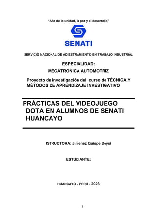 El documento describe la creciente práctica de los videojuegos, especialmente el juego Dota, entre los estudiantes de SENATI Huancayo. Explica que los jóvenes encuentran en los videojuegos una forma de entretenimiento y de interactuar con sus pares. La investigación busca describir por qué los estudiantes de SENATI participan en específico del juego Dota.