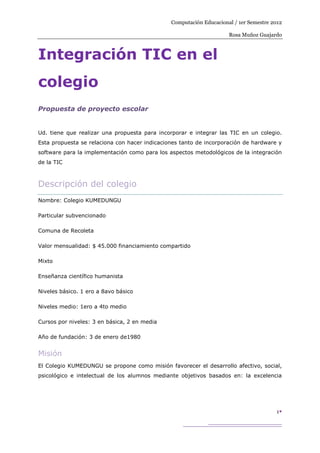 La propuesta presenta un proyecto para integrar las TIC en el Colegio KUMEDUNGU a través de la implementación de la plataforma Moodle. El proyecto consistiría en capacitar a los docentes, acondicionar un laboratorio e implementar Moodle inicialmente en las clases de matemáticas de 1o medio. Se detallan las etapas, recursos, costos e implementación curricular, incluyendo una marcha blanca y evaluaciones del proyecto.
