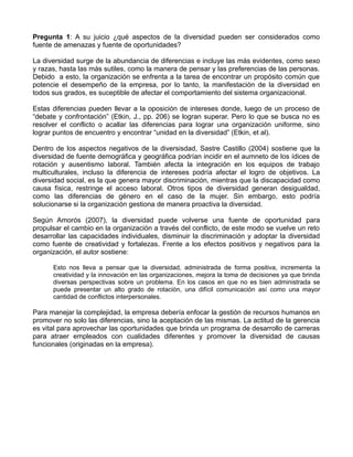 Este documento contiene las preguntas y respuestas de un examen parcial de la asignatura Administración de Recursos Humanos III. La primera pregunta discute los aspectos positivos y negativos de la diversidad que pueden ser oportunidades o amenazas para una organización. La segunda pregunta trata sobre los conceptos que los gerentes deben tener claros para implementar la polifuncionalidad en una empresa. La tercera pregunta pide explicar un capítulo sobre procesos de cambio en las organizaciones. La cuarta pregunta analiza si los graduados en Administra