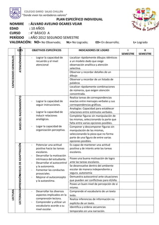 Este documento presenta el Plan Específico Individual de Álvaro Avelino Ocares Vejar, un estudiante de 10 años de 4° básico. El plan evalúa sus capacidades en atención, memoria, razonamiento, adaptación y lectoescritura, con objetivos específicos e indicadores de logro para cada área. El plan busca mejorar sus habilidades a través del desarrollo de capacidades como la comprensión lectora, escritura, numeración y resolución de problemas matemáticos.