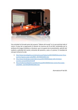 El chef gallego Pepe Solla dio una charla a los alumnos de 3o y 4o de ESO sobre gastronomía y la importancia de la física y química en la cocina. Solla utilizó su experiencia y un huevo para mostrar cómo la temperatura afecta la textura y el sabor de los alimentos. Además, destacó su colaboración con científicos para mejorar sus platos de forma sostenible.