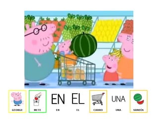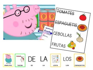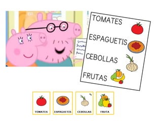 Peppa Pig y su familia van a hacer la compra al supermercado para comprar tomates, espaguetis, cebollas, frutas y una tarta.