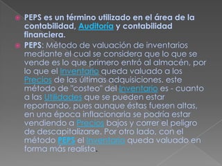 PEPS es un método de valuación de inventarios donde los primeros artículos que se compran son los primeros que se venden, valuando así el inventario final al precio de las últimas adquisiciones. Esto permite valuar el inventario de forma más realista, aunque puede reportar utilidades altas en épocas de inflación. El ejemplo muestra las operaciones de compra-venta de un artículo usando PEPS, valuando las ventas al precio de las primeras entradas y actualizando el saldo final.