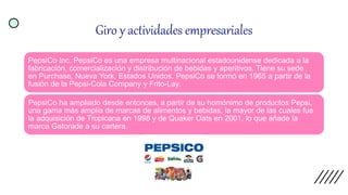 PepsiCo es una empresa multinacional dedicada a la fabricación y distribución de bebidas y aperitivos. Su misión es crear momentos de alegría a través de sus productos nutritivos y experiencias de marca. Para lograrlo, implementó el sistema Warehouse Management System DLX para mejorar la productividad en sus almacenes mediante el manejo ordenado de operaciones y recibo/despacho rápido. Sin embargo, este sistema también conlleva riesgos como la confusión de empleados y posibles accidentes. El éxito de la estrategia depen