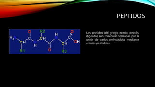 Los péptidos son moléculas formadas por cadenas de aminoácidos unidos por enlaces peptídicos y se clasifican según su longitud en oligopéptidos, polipéptidos y proteínas. Las proteínas desempeñan funciones vitales en los organismos, incluyendo catalizadores, transporte, estructura y regulación hormonal, y se organizan en cuatro niveles de estructura primaria a cuaternaria. Su desnaturalización puede ocurrir por cambios en temperatura o pH, afectando su funcionalidad, y tienen múltiples aplicaciones en la industria alimentaria y agroindustrial.