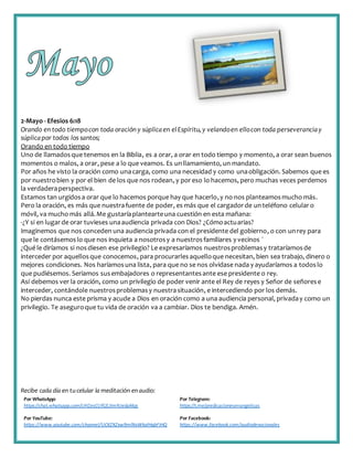 El documento presenta reflexiones diarias basadas en pasajes bíblicos, alentando a elevar la mirada hacia Dios en momentos de dificultad y a mantener una vida de oración activa como un privilegio. Se enfatiza que Dios es un refugio seguro y que al hacer el bien a otros, debemos hacerlo sin desmayar, confiando en Su dirección y poder. Además, se recuerda la importancia de mantener la fe y la vigilancia en la vida cristiana para no caer en la desmotivación ante las adversidades.