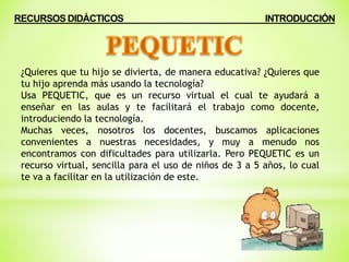 Este documento describe un recurso educativo llamado PEQUETIC que ayuda a introducir a niños de 3 a 5 años al mundo de la tecnología de manera didáctica a través de juegos en línea. PEQUETIC busca desarrollar habilidades motrices y de concentración en los niños al tiempo que les enseña sobre conceptos básicos de computación. El documento explica cómo acceder y usar los diferentes juegos de PEQUETIC y sus objetivos educativos.