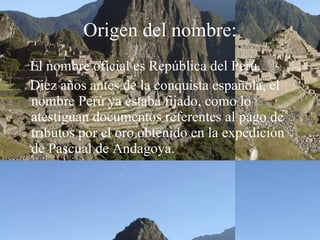 El documento resume información básica sobre Perú, incluyendo que su nombre oficial es República del Perú, su bandera se inspiró en las aves parihuanas, su capital es Lima, su moneda es el Nuevo Sol, y su día de independencia es el 28 de julio de 1821.