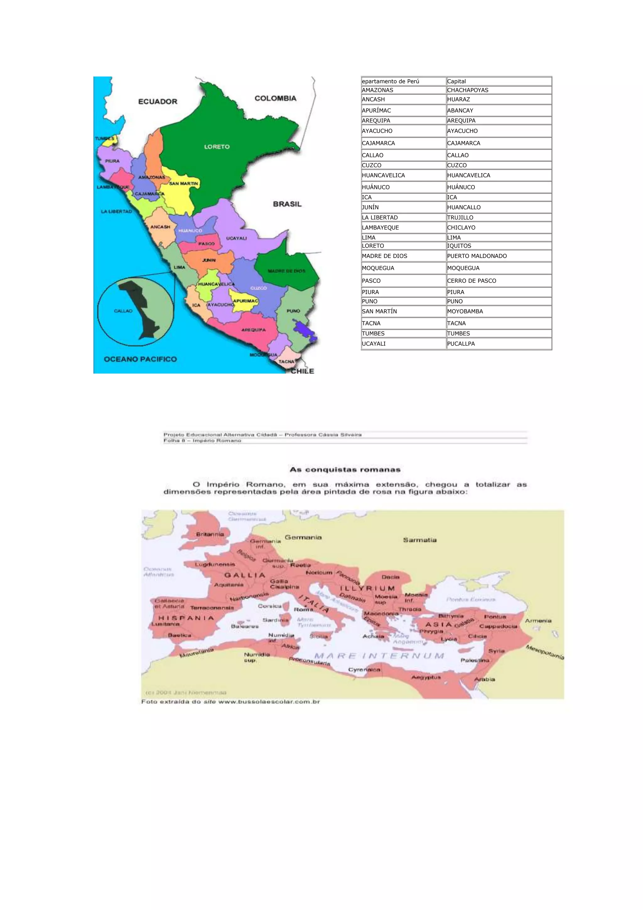 Este documento lista los 25 departamentos de Perú y sus respectivas capitales. Proporciona el nombre de cada departamento seguido de su capital entre paréntesis. Los departamentos se enumeran en orden alfabético y sus capitales se presentan en la misma línea debajo del nombre del departamento.