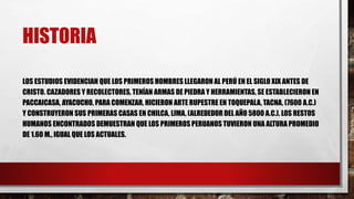 Los primeros hombres llegaron al Perú hace aproximadamente 19,000 años. Construyeron las primeras casas en Chilca, Lima hace unos 5,800 años. Actualmente, el Perú tiene una población de aproximadamente 31 millones de habitantes, la mayoría de los cuales viven en áreas urbanas. La bandera peruana consiste en tres franjas verticales rojas y blancas.