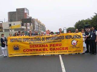El documento describe la magnitud global y nacional del cáncer, los recursos disponibles para su tratamiento en Perú, y los planes para mejorar la prevención y el control del cáncer a través de una Coalición Multisectorial. Se espera que para el 2016 haya menos casos avanzados de cáncer en Perú gracias a mayores esfuerzos de prevención, detección temprana y acceso a servicios de calidad.