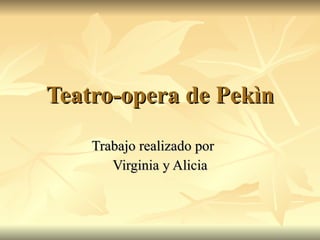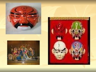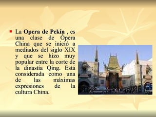 La ópera de Pekín es una forma de ópera china que se originó en el siglo XIX y se hizo popular en la corte imperial china. Se cree que comenzó en 1790 cuando un grupo teatral realizó una presentación para el emperador Qianlong. La ópera de Pekín tiene cuatro tipos de personajes principales, tres masculinos y uno femenino, que se distinguen por su maquillaje y vestuario. Las historias cubren temas como intrigas de la corte y hazañas militares e involucran canto, música