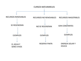 Los recursos naturales se dividen en renovables, no renovables e inagotables. Los recursos renovables como la energía solar, eólica y el agua se regeneran constantemente, mientras que los no renovables como los combustibles fósiles tienen una reserva finita y no se regeneran. Los recursos inagotables como la energía solar y eólica son constantes.
