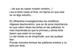 El documento presenta varias ilusiones ópticas y experimentos que demuestran las capacidades asombrosas del cerebro humano para reconocer palabras y patrones a pesar de errores ortográficos o de orden de las letras, así como para ver movimiento y formas aunque estén estáticas. También incluye una ilusión que supuestamente hará aparecer la imagen de una persona al parpadear luego de mirar fijamente puntos centrales, lo que demuestra la habilidad del cerebro para crear asociaciones.