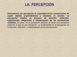 La percepción implica un proceso activo de atención, selección, organización e interpretación de las sensaciones. Se produce a través de los órganos sensoriales y el sistema nervioso central, detectando estímulos, transmitiendo señales al cerebro y procesándolas. La teoría de la Gestalt sostiene que la percepción es la configuración de elementos en forma, no su asociación. Sus leyes incluyen proximidad, continuidad, semejanza y cierre. Las ilusiones ópticas surgen de factores fisi