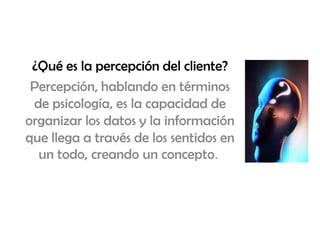 El documento describe la percepción del cliente como la capacidad de organizar la información sensorial en un concepto. Factores como las necesidades, expectativas, estilo personal y cultura influyen en la percepción. Los procesos de percepción incluyen la exposición, distorsión y retención selectiva de información. La percepción del cliente es importante para los mercadólogos porque forma la imagen que el cliente tiene de una empresa.