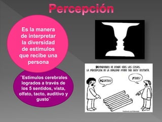 Este documento define y explica los conceptos de percepción, sensación y estímulo. Define la percepción como la manera de interpretar la diversidad de estímulos que recibe una persona. Explica que una sensación es la respuesta de los órganos a los estímulos, los cuales pueden ser internos o externos. Finalmente, señala algunas diferencias entre percepción, sensación y estímulo.