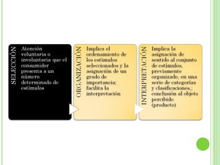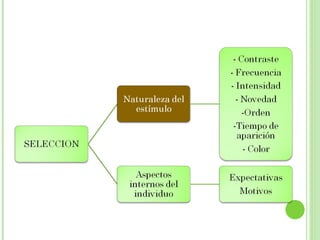 El documento trata sobre la percepción y cómo los individuos interpretan los estímulos de manera subjetiva para entender el mundo. Define la percepción como el proceso mediante el cual una persona selecciona, organiza e interpreta los estímulos. Explica que la percepción depende de factores internos como las experiencias y necesidades del individuo, así como de factores externos como los estímulos.