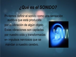 Este documento explica los procesos de la audición y la visión. Describe que el sonido se produce por la vibración de objetos y es captado por el oído. Explica que las vibraciones pasan por el conducto auditivo y mueven tres huesos hasta llegar al cerebro. También describe que la visión ocurre cuando la luz rebota en objetos y entra en el ojo, siendo refractada y enfocada en la retina, donde se convierte en impulsos nerviosos que viajan al cerebro. En conclusión, destaca la importancia de est