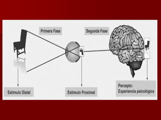 Según el documento, el proceso perceptivo consiste en hallar un tipo de estímulo (estímulo distal) a partir de otro tipo de estímulo (estímulo proximal). Esto es posible gracias a operaciones cognitivas que construyen una representación del estímulo distal utilizando la información del estímulo proximal junto con conocimientos previos. El modelo cognitivo describe la percepción como un proceso de cálculo que involucra transducciones sensoriales y funcionales para obtener la representación distal.