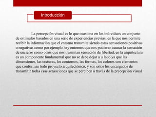 El documento trata sobre la percepción visual y su importancia en el campo de la arquitectura. Explica que la percepción visual implica la capacidad de reconocer y interpretar estímulos visuales basados en experiencias previas. En la arquitectura, elementos como la forma, el color, la textura y el tamaño son fundamentales para transmitir sensaciones al observador. También describe las leyes de la Gestalt y cómo afectan la percepción de formas y figuras.