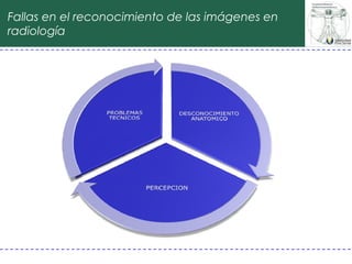 El documento describe los procesos visuales involucrados en la percepción de imágenes radiológicas. Explica que la primera visión es periférica para localizar el área de interés, luego se produce un enfoque fotópico más detallado seguido de movimientos sacádicos. Los hallazgos se detectan rápidamente en los primeros 15 segundos y expertos los ven más rápido. La percepción depende de conceptos visuales memorizados y entrenamiento es más efectivo que enfocarse solo en identificar patologías.