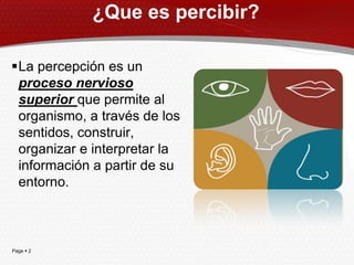 El documento describe la percepción como un proceso nervioso superior que permite a los organismos construir representaciones del entorno a través de los sentidos. La percepción es el primer proceso cognitivo mediante el cual se captan datos del entorno y se forman modelos internos de la realidad. Estos modelos se generan de forma inferencial y constructiva a partir de la información sensorial y la memoria. El conocimiento resulta de la modificación del sistema nervioso central a través de la interacción con el entorno y se almacena en la memoria, proporcionando vent
