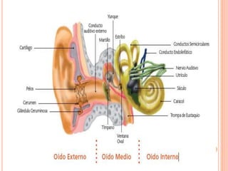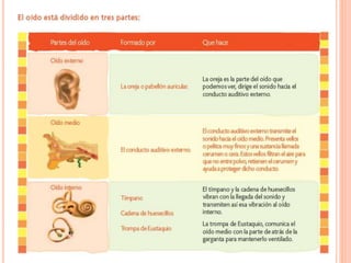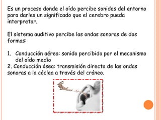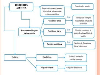 El documento describe el proceso de percepción auditiva y cómo los niños desarrollan esta habilidad a través de diferentes áreas de entrenamiento. Estas áreas incluyen aprender a reconocer sonidos espontáneos, diferenciar voces, producir sonidos con el cuerpo, y realizar pruebas como el test de Ling para evaluar la percepción del habla. El documento también proporciona ejemplos de actividades para desarrollar la percepción auditiva en los niños, como juegos, rimas y lectura interactiva.