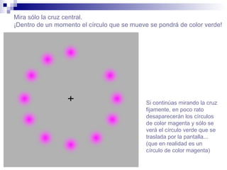El documento describe varios experimentos ópticos relacionados con la percepción del color, incluyendo mirar una cruz fijamente hasta que los círculos de color desaparezcan excepto uno verde que se mueve, comparar rectángulos grises, comparar figuras de color, mirar un punto fijo y mover el ratón sobre una imagen para que parezca en color.