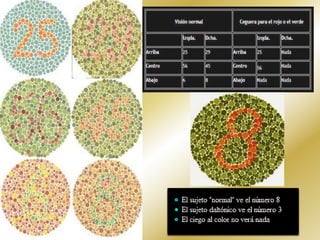 El documento presenta información sobre la percepción del color, incluyendo las teorías tricromática y del proceso oponente de la visión del color, las deficiencias en la visión cromática, y cómo el sistema nervioso crea la experiencia del color a través de la constancia del color.