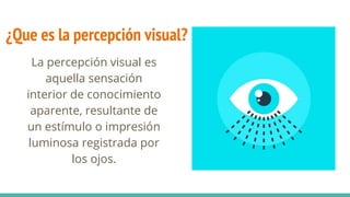 La percepción visual es la sensación interior de conocimiento que resulta de un estímulo luminoso registrado por los ojos. Un estímulo provoca una reacción y la sensación da una respuesta inmediata a los sentidos, mientras que la percepción interpreta las sensaciones atribuyéndoles significado y organizándolas. La percepción es como el cerebro interpreta los estímulos sensoriales a través de los sentidos para formar una impresión consciente de la realidad.