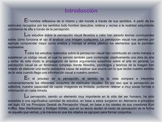 Este documento presenta un resumen de tres oraciones o menos de la teoría de la percepción visual y las leyes de la Gestalt. Explica que la percepción visual implica la capacidad de reconocer, discriminar e interpretar estímulos visuales y que la teoría de la Gestalt propone que la mente organiza los elementos visuales de acuerdo a leyes como la proximidad, simplicidad y continuidad para formar gestalt o formas completas.