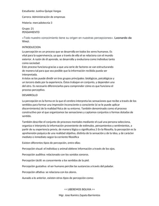 El documento describe el proceso de percepción, explicando que es la forma en que el cerebro interpreta las sensaciones a través de los sentidos para formar una impresión del entorno. Explora los diferentes tipos de percepción como visual, auditiva, táctil, gustativa y olfativa, así como la percepción social, musical, del movimiento, sensorial y extrasensorial. También analiza la percepción desde las perspectivas de la psicología y la filosofía. Finalmente, resume las características clave de la percepción como ser inferencial, constructiva