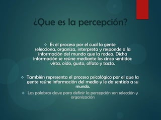 Este documento describe la percepción y las atribuciones. Define la percepción como el proceso por el cual las personas seleccionan, organizan e interpretan información de su entorno a través de los sentidos. Explica que la percepción está influenciada por factores externos e internos como la personalidad y motivación. También habla sobre los errores de percepción como los estereotipos y la primera impresión. Por último, define la atribución como las causas percibidas de un comportamiento y cómo esto afecta los sentimientos hacia esa persona.