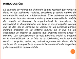 Este documento discute la pérdida de valores en la sociedad actual y sus causas y consecuencias. Explica que la falta de enseñanza de valores en las familias y escuelas, así como los medios de comunicación, han contribuido a este problema. También analiza posibles soluciones como fomentar una cultura de paz, enseñar valores de manera práctica en las escuelas, y apoyar a las familias en la educación de valores. El documento concluye que promover el amor y la enseñanza de valores ayudará a