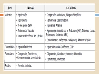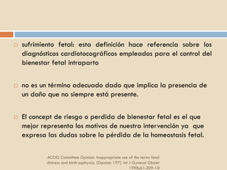 Este documento describe el sufrimiento fetal agudo, incluyendo sus definiciones, etiología, signos, pruebas de diagnóstico y tratamiento. Explica que es una emergencia obstétrica que requiere atención inmediata y que si no es tratada puede causar daño cerebral permanente o la muerte del feto. Detalla los diferentes métodos para monitorear el bienestar fetal y las intervenciones como la cesárea urgente necesarias para prevenir complicaciones graves.