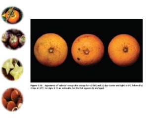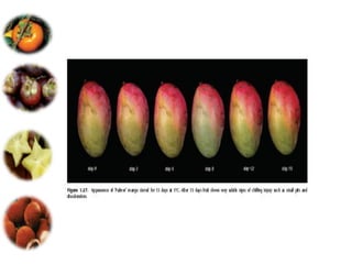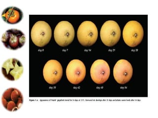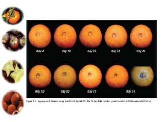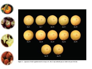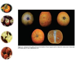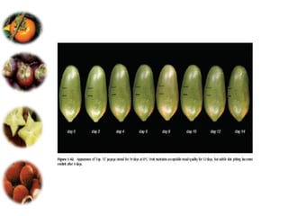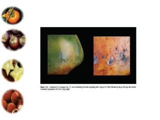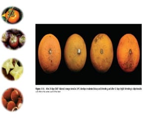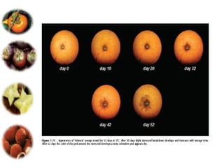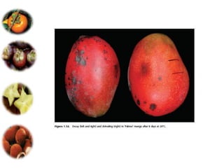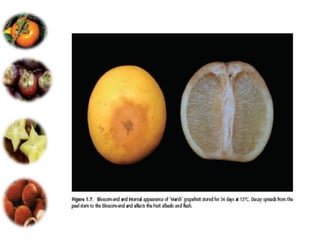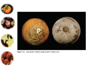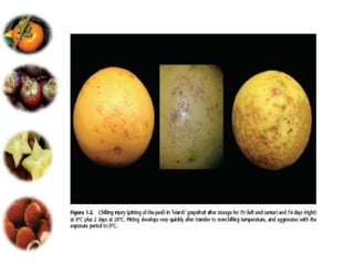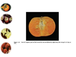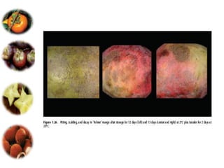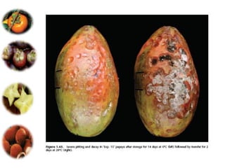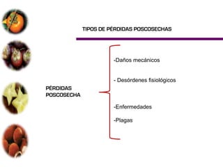 El documento aborda las pérdidas poscosechas en frutas y hortalizas, incluyendo daños mecánicos, enfermedades y desórdenes fisiológicos. Se detallan las causas de estas pérdidas, como la manipulación inadecuada y las infecciones por patógenos, así como algunas estrategias de control, como el uso de fungicidas y la higiene en el manejo de productos. También se menciona el impacto de factores abióticos y la importancia de condiciones de almacenamiento adecuadas para minimizar el deterioro.